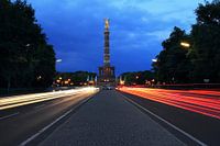 De Berlijnse Overwinningszuil op de Strasse des 17. Juni met veel verkeer op het blauwe uur.