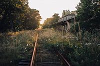 Koop dit landschapskunstwerk Overwoekerd treinspoor bij zonsondergang van Imperial Art House op canvas, aluminium dibond, (ingelijste) fotoprint, behang en ArtFrame, op maat geprint in Fine-Art kwaliteit.