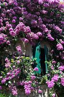 Raam overwoekerd door de bougainvillea (Bougainvillea is een geslacht uit de familie Nyctaginaceae. Soorten en kruisingen uit het geslacht worden toegepast als tuin- en kamerplant.