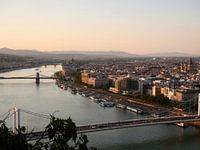 Uitzicht op de stad Boedapest en de Donau bij ondergaande zon. Gezien vanuit het Gellerthegy Park, waar ook de Citadella staat. Budapest is een levendige stad die vol hippe plekjes en mooie bruggen.