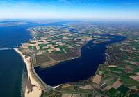 Overzicht van het voormalig eiland Noord-Beveland met aan de zuidzijde Veerse Meer(rechts) en aan de Noordzijde Oosterschelde(links boven). Op de voorgrond de Veersegatdam en Noordzee.