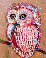 "Owla" is een expressief en kleurrijk schilderij van een schattige uil. Met levendige penseelstreken en een speels kleurgebruik komt de persoonlijkheid van de uil tot leven. De heldere tinten geven het werk een vrolijke en energieke uitstraling, terwijl de expressieve stijl zorgt voor beweging en emotie. Owla kijkt de toeschouwer met niewsgierige ogen aan, een mengeling van wijsheid en vertedering. Het schilderij straalt warmte en positiviteit uit, en nodigt uit om even stil te staan bij de charme van dit kleine boswezen.