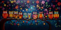 Owls on a Branch is een digitaal schilderij van een groep uiltjes met grote ogen op een tak. De levendige kleuren en details van het werk prikkelen de zintuigen en brengen leven in elke kamer.