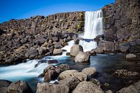 Deze prachtige waterval licht in het thingvellir National park in IJsland. Het witte zijdezachte water spat van de strakblauwe lucht af. Rechts ook nog een kleine regenboog glimp.