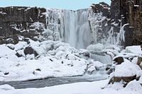 De Oxararfoss waterval in het IJslandse nationale park Pingvellir. In de winter is de waterval omgeven door een sneeuwlandschap en zijn de randen van de waterval bevroren.