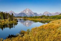 Oxbow Bend Turnout in de Snake River met een weerspiegeling van Mount Moran. Grand Teton National Park, Wyoming USA.