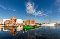 Het loodsgebouw, het natuurhistorisch museum Ozeaneum, het traditionele zeilschip Petrine en het voormalige opleidingsschip Gorch Fock 1 in de haven van de Hanzestad Stralsund aan de Oostzee in Mecklenburg-Vorpommern, Duitsland.