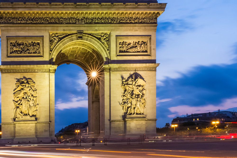 De Arc de Triomphe is een monument dat tussen 1806 en 1836 werd opgericht op de Place Charles-de-Gaulle in Parijs. Indrukwekkend uitzicht na zonsondergang.