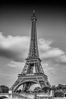 De Eiffeltoren in Parijs, 324 meter hoog, domineert het stadsbeeld. Het is een van de meest bezochte bezienswaardigheden ter wereld. Hier is een typisch uitzicht op de Eiffeltoren. Klassieke monochrome impressie van de oevers van de Seine.