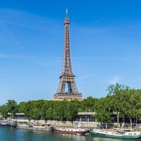 De Eiffeltoren in Parijs, 324 meter hoog, domineert het stadsbeeld. Het is een van de meest bezochte monumenten ter wereld. Hier is een typisch uitzicht op de Eiffeltoren. Klassieke impressie van de oevers van de Seine.