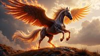 Boven de brandende horizon rijst PEGASUS op, het vliegende vuurpaard van de schemering. Dit mythische paard spreidt zijn machtige vleugels die in gouden vlammen gloeien, terwijl zijn hoeven de aarde raken als vonken. Het is niet zomaar een fabeldier, maar een oeroud dier van vuur en licht, geschapen om tussen hemel en eeuwigheid te reizen.