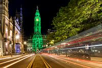 Het uitzicht op Philadelphia City Hall langs North Broad Street in de avond is een adembenemende ervaring. De lichten van de auto's en bussen lopen als gloeiende lijnen door het beeld en geven het tafereel een levendige dynamiek. Het iconische standbeeld van William Penn rijst majestueus de lucht in aan de top van het imposante stadhuis met zijn prachtige architectuur. Het gebouw werd tussen 1871 en 1901 gebouwd in Victoriaanse stijl. De klokkentoren aan de noordkant is 167,03 meter hoog en is daarmee het hoogste gemetselde gebouw ter wereld.