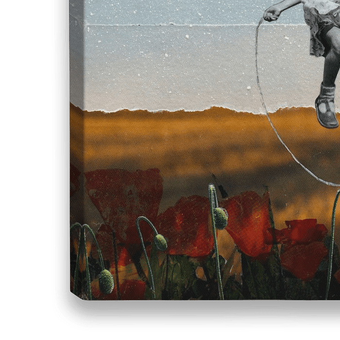 Het originele werk, een collage op papier, is een prijswinnend kunstwerk tijdens een collage expositie in Frankrijk, 2019.Een meisje vermaakt zich met haar springtouw op een warme zomerdag, in een zomer landschap vol klaprozen. Een retro beeld van een spelend kind. Iets wat vroeger heel gewoon was, maar nu nog zelden te zien is.