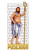Poseidon staat zelfverzekerd met de gouden drietand in zijn hand. Zijn figuur is krachtig en trots, het witte gewaad vloeit losjes om hem heen. De verticale herhaling van zijn naam op de achtergrond benadrukt zijn goddelijke karakter.