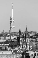 Zwart-wit stadsgezicht van Praag met de Žižkov TV-toren
