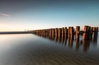 Spiegelend paalhoofd Westkapelle tegen zonsondergang