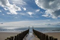 De paalhoofden die op het strand staan bij Vlissingen Zeeland staan er ter bescherming tegen de zee. Het zicht op de Noordzee achter de palen geven een weids gevoel.