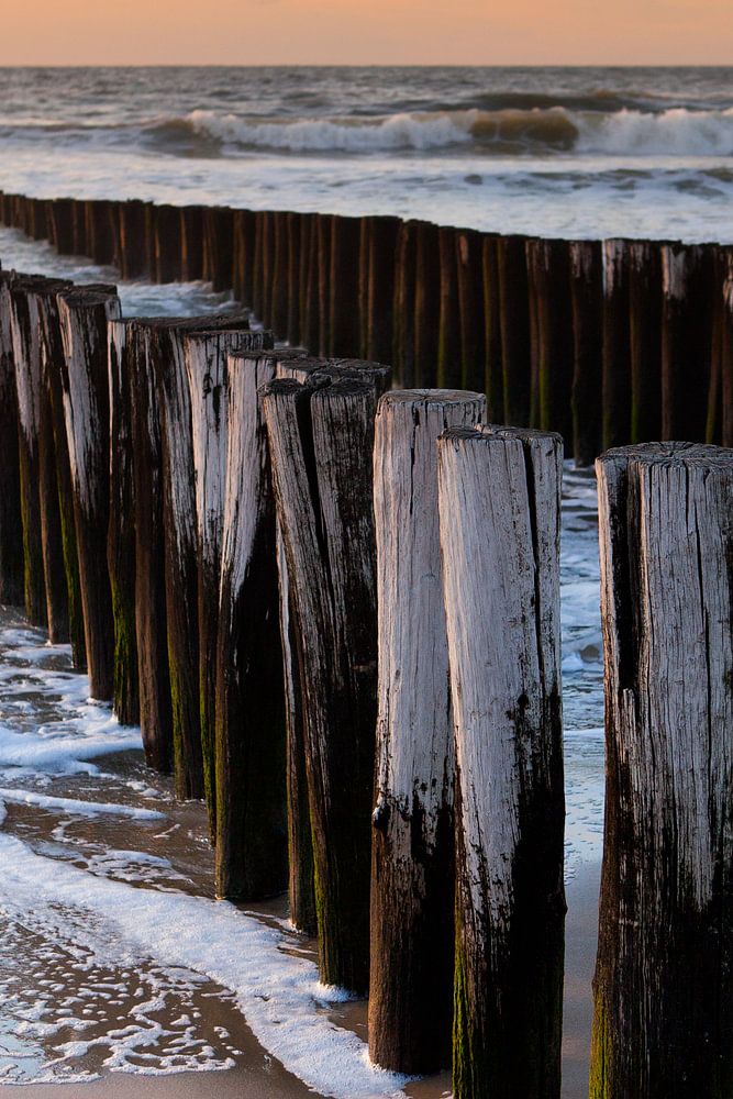 De welbekende paaltjes aan de Zeeuwse kust. Deze paaltjes, ofwel golfbrekers bij ondergaande zon op het strand van Domburg
