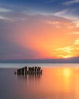 Dicht bij de dijk in Hindeloopen in Friesland aan het IJsselmeer staan een aantal golfbrekers. Dit zijn een rij oude paaltjes. De foto is met een langere belichtingstijd gemaakt zodat het water en de lucht zachter worden. Hindeloopen licht in de provincie Friesland aan het IJsselmeer wat vroeger Zuiderzee werd genoemd.