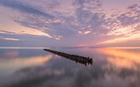 Bij het strandpaviljoen Hindeloopen in de provincie Friesland staan deze paaltjes/golfbrekers in het IJsselmeer. De mooie zonsondergang in de zomer werpt een mooie gloed over het stille water bij het IJsselmeer. De robuuste paaltjesrij weerspiegelt in het spiegelgladde oppervlak on een hemel die zacht kleurt van blauw naar oranje en roze. Ee vredig en serene Fries landschap, gevangen in het gouden uur. Hindeloopen of Hylpen in het Fries, is een mooi en charmant stadje in de provincie Friesland direct gelegen aan het IJsselmeer. Het staat bekend om zijn maritieme geschiedenis, uniek cultuur en schilderachtige uitstraling. Hindeloopen was in de 17e en 18e eeuw een belangrijke handelsstad, met bloeiende scheepsvaar en handel met landen rond de Oostzee.