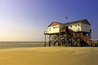 De beroemde paalwoningen op het strand van St. Peter Ording/ Sleeswijk-Holstein.