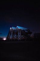De paalwoningen bij St. Peter-Ording aan de Noordzee 's nachts.
