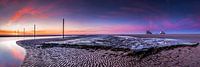 Aan het eind van een prachtige dag, bij eb, verschijnt het brede strand in een zacht glinsterend en kalm avondlicht. De wind neemt gewoonlijk 's avonds af, zodat de kleuren en wolken van de avondgloed worden weerkaatst in het water van de kleine getijdewegen. Landschapsfoto / Strandfoto 310030ays