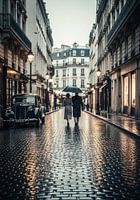 Een koppel loopt onder een paraplu in de regen op een Parijse straat. Vintage auto en gebouwen zichtbaar.