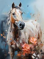 Een schilderij toont een paard. Het dier straalt rust uit, omgeven door een lichtgevende atmosfeer. Plotseling explodeert rondom zijn benen een vibrerende mix van oranje roze kleuren, waaruit enkele bloemen tevoorschijn komen als levendige accenten. Dit contrast tussen sereniteit en levendigheid creëert een intrigerend spel van emotie…