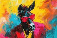 Paard Bril - Op dit dieren schilderij zie je een opvallende zwart paard met een felgekleurde bril en een kleurrijke achtergrond in geel, blauw en roze, wat het schilderij een moderne en levendige uitstraling geeft.