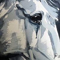 Een krachtig aquarel van een paardenhoofd. De focus bij dit kunstwerk ligt op het oog van het paard.