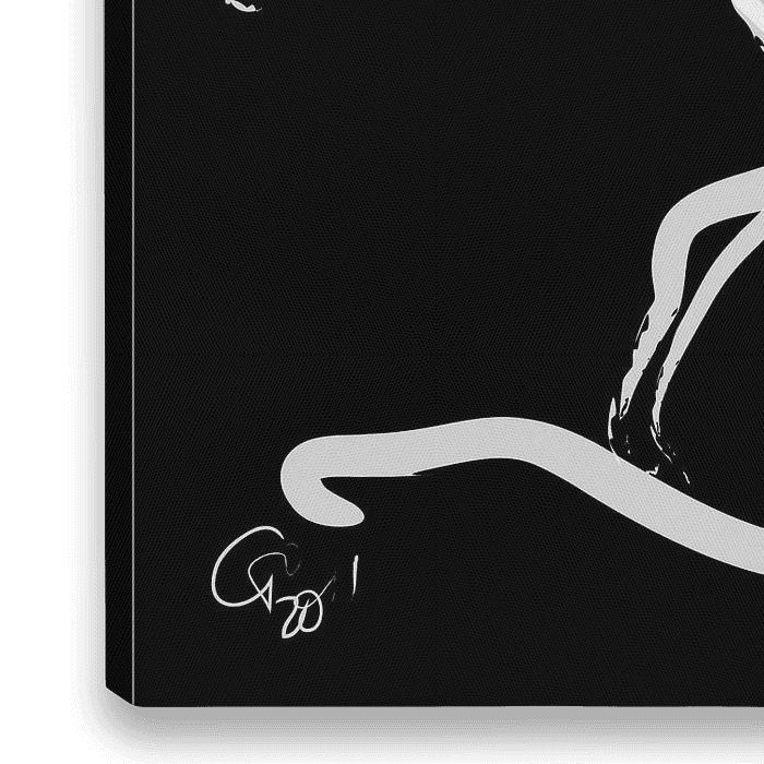 Een modern zwart wit schilderij van een rennend paard. Minimalistisch kunstwerk met ferme kwaststreken.
