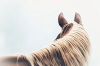 Dit ingetogen portret van een paard, vastgelegd vanuit een unieke achteraanzicht, ademt rust en eenvoud. De zachte, golvende manen vallen gracieus langs de nek, terwijl de oren nieuwsgierig naar voren gericht zijn, alsof het paard aandachtig luistert naar de geluiden om zich heen. Het subtiele kleurenspel en de minimalistische achtergrond benadrukken de serene uitstraling van het beeld. Deze foto is een perfect stuk voor liefhebbers van paardenschoonheid en minimalistische kunst, een tijdloze aanvulling op elk interieur dat rust en verfijning waardeert.