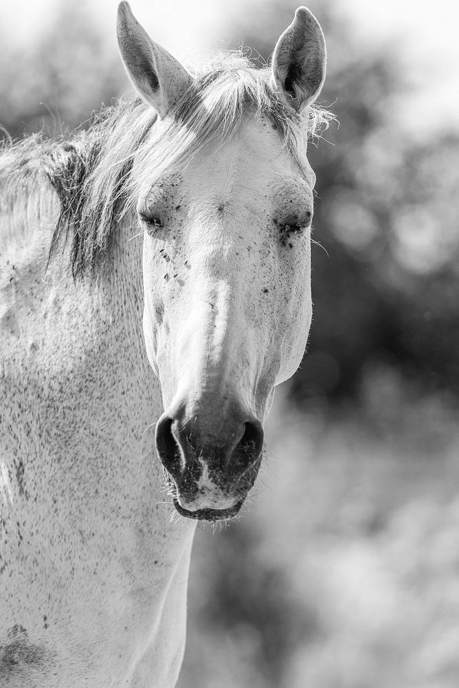 Dit adembenemende portret, "Sereniteit in Zwart-Wit", toont een wit paard in al zijn majestueuze schoonheid. De monochrome tonen benadrukken de sierlijke lijnen en zachte uitstraling van het dier, terwijl de achtergrond met subtiele natuurlijke details een tijdloze en rustieke sfeer creëert. De vlekken op de vacht van het paard voegen karakter en textuur toe, wat een authentiek gevoel van het buitenleven geeft. Dit kunstwerk straalt rust uit en zou een stijlvolle toevoeging zijn aan elke ruimte, ideaal voor liefhebbers van paarden en de rustieke charme van de natuur.