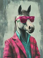 Paard Zonnebril - Op dit dieren schilderij zie je een paard met een bijzonder uiterlijk, gekleed in een felrood geruit jasje en roze zonnebril, wat het een moderne en speelse uitstraling geeft.