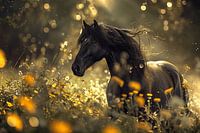 Een schilderachtige scène wordt onthuld door de lens: een majestueus paard dat zich bevindt te midden van een zee van bloemen. Zijn vacht, een mix van krachtig zwart en glinsterend bruin, steekt af tegen de levendige kleuren van de flora. De bloemen strekken zich uit in een bonte lappendeken van rood, geel, blauw en paars, waarbij elk bloemblaadje zijn eigen verhaal vertelt. De zon werpt warme stralen op het tafereel, waardoor de kleuren nog levendiger worden en de hele scene doordrenkt lijkt met een gouden gloed. Het paard, elegant en krachtig, galoppeert met gratie tussen de bloemen door, zijn manen wapperend in de wind terwijl het de geur van de lente opsnuift. De afbeelding straalt een gevoel van vrijheid, schoonheid en harmonie uit, een moment van pure sereniteit te midden van de natuur.