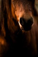 Deze close-up van een paardenneus vangt op intieme wijze de zachtheid en textuur van het dier, badend in warm, schemerlicht. De subtiele schaduwen en rijke bruine tinten versterken het gevoel van rust en nabijheid, terwijl de onscherpe achtergrond het oog volledig naar het centrale detail trekt. Het beeld roept een zintuiglijke beleving…