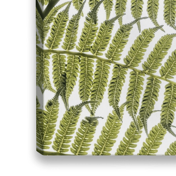 Een elegant wit paard verschijnt sereen op een helderwitte achtergrond, deels omsloten door een waaier van fijnzinnige varenbladeren. De zachte contouren van het dier contrasteren subtiel met de gedetailleerde structuur van het blad, wat een visuele balans oproept tussen dierlijke gratie en botanische precisie. Deze artistieke compositie ademt rust, puurheid en verbondenheid met de natuur — een beeld dat uitnodigt tot verstilling en reflectie. Ideaal voor interieurs met een liefde voor eenvoud, monochrome accenten en natuurlijke elegantie.