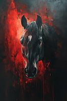 Deze indrukwekkende kunstafbeelding toont het hoofd van een zwart paard dat dramatisch oprijst uit een vurige, rood-zwarte achtergrond. De spatten van rood rond het krachtige dier versterken het gevoel van energie, mysterie en ongetemde kracht. De lichtval op de vacht en de intense blik geven het portret een bijna filmisch karakter. Dit werk spreekt liefhebbers van expressieve, moderne dierkunst aan en is een gedurfde keuze voor interieurs met karakter.