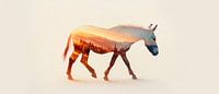 Een majestueus paard, doorkruist door dromerige landschappen, voert je mee naar de uitgestrektheid van de natuur. De zachte kleurovergangen van de zonsondergang en de harmonieuze combinatie van dier en landschap stralen rust uit. Dit kunstwerk is perfect voor de woonkamer om een uitnodigende, ontspannen sfeer te creëren.