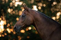 Prachtig paard (Methar) in de ondergaande zon die tussen de bomen door schijnt. Dit geeft een mooi bokeh effect op de achtergrond.