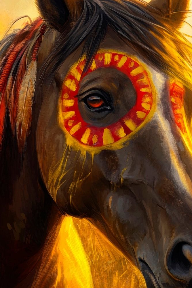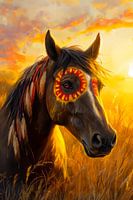 Een majestueus paard met felrode en oranjekleurige ogen, omringd door gouden velden, straalt een mystieke aura uit. De zonsondergang baadt het tafereel in warm licht en benadrukt de bewegende manen, terwijl de speciale versiering rond de ogen nieuwsgierigheid opwekt en de verbinding tussen natuur en spiritualiteit belichaamt.