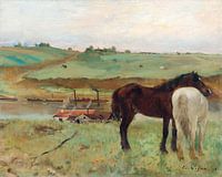 Twee paarden staan in een weiland. Een bruin paard en een schimmel paard staan te knuffelen. Onderaan de heuvel van dit landschap komen stoomboten voorbij. De voorste stoomboot of stoomschip maakt grote pluimen zwarte rook en de tweede boot of het schip heeft dat niet. Tevens ligt een boerderij onderaan bij de kust.