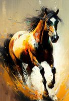 In dit werk zie je een krachtig galopperend paard dat elegant en vol energie in beeld is gebracht. Het spel van licht en schaduw benadrukt de gespierde contouren en beweging van het paard, waardoor je bijna de snelheid en kracht kunt voelen. De combinatie van natuurlijke aardetinten en de gedetailleerde weergave van het dier maken dit werk bijzonder dynamisch.