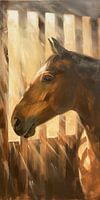 'Paard in het Zonlicht' vangt een intiem moment van een nobel paard dat geniet van de warme zonnestralen. De natuurlijke bruine tonen van de vacht en de spelende schaduwen creëren een levendige textuur en diepte, terwijl de lichtbanen een rustige sfeer toevoegen. De expressie van het paard straalt rust en een zekere wijsheid uit, waardoor dit beeld een rustgevend element is voor iedere omgeving.