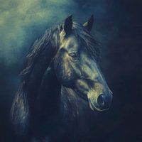 Een adembenemende afbeelding van een zwart paard met vloeiende manen tegen een sfeervolle achtergrond. De belichting benadrukt de gespierde bouw en expressieve ogen van het paard.