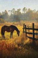 Dit sfeervolle schilderij toont een paard dat rustig graast in een gouden, met gras begroeid veld bij zonsondergang. Het warme licht van de ondergaande zon werpt een zachte gloed over het landschap, waardoor de serene natuur tot leven komt. De gedetailleerde weergave van het paard en de omringende omgeving straalt een rustgevende en tijdloze sfeer uit, perfect voor wie de kalmte van het platteland in huis wil halen. Een prachtige keuze voor de liefhebber van dieren en natuurlijke landschappen.