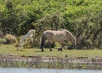Een Fjordenpaard met een heel blij wit veulen, in natuurgebied Hellegatsplaten op het eiland Goeree-Overflakkee in Zuid-Holland in Nederland.