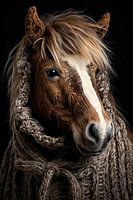 Een fantasie foto van een prachtig paard met een gebreide vacht en een heerlijk dikke winterse trui aan. Het is een fotorealistisch beeld maar natuurlijk wel eentje met een rijke fantasie. Daardoor blijf het beeld je ook boeien.