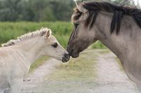 Liefde op een zomerse dag, tussen een wild konikpaard en haar veulen, in natuurgebied Oostvaardersplassen, in de provincie Flevoland in Nederland.